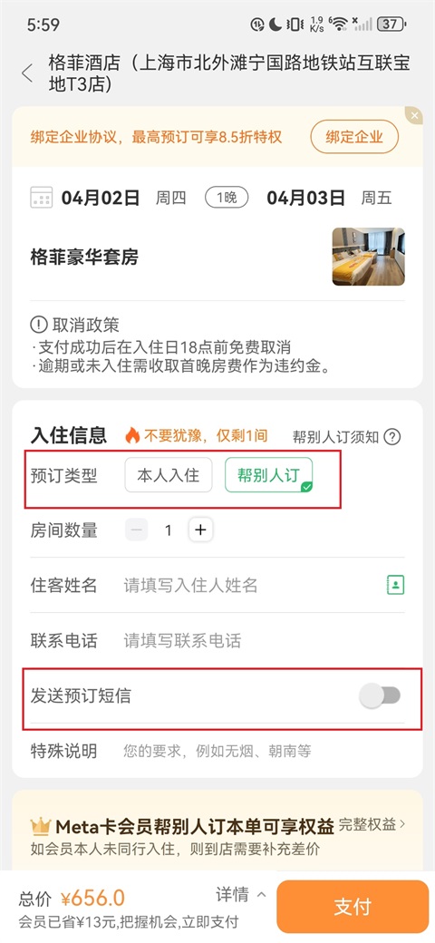 5、在预订页面,选择"帮别人订",填写住客姓名、联系电话,按需开启"发送预订短信";确认订单信息后,点击"支付",完成付款。