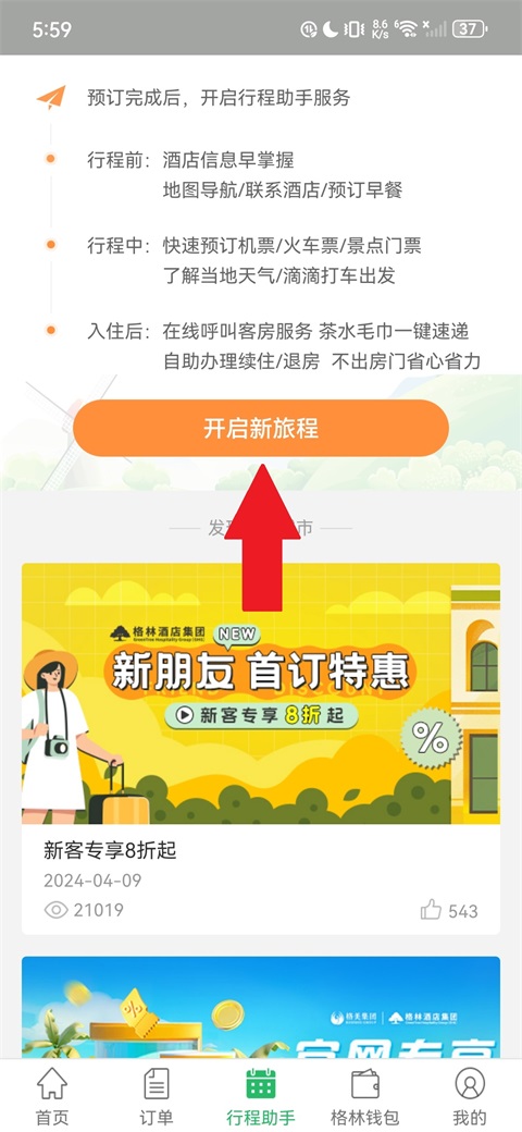 1、在底部导航栏选择"行程助手";点击"开启新旅程",即可查看行程服务;