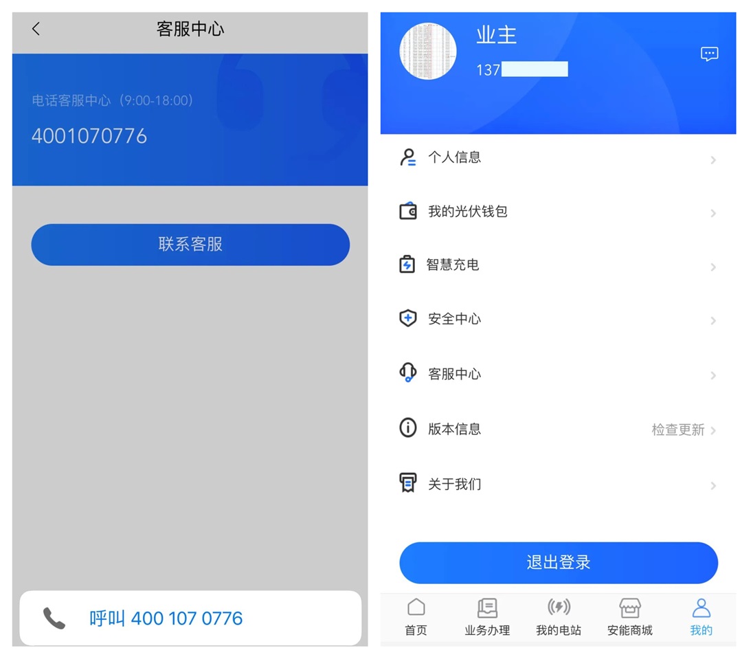 正泰安能自有运维品牌「小安到家」,为电站提供专业清洗和检修服务。在App的客服中心界面,用户可以一键拨打7x24小时服务热线:400-107-0776。后台智能派单,运维工程师1小时快速响应,48小时内上门,订单完成后还将进行电话回访。