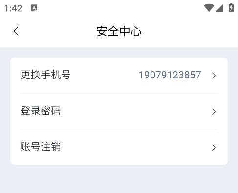 在App端“我的 - 安全中心”里,用户可以进行手机号码换绑、登录密码修改和账号注销。