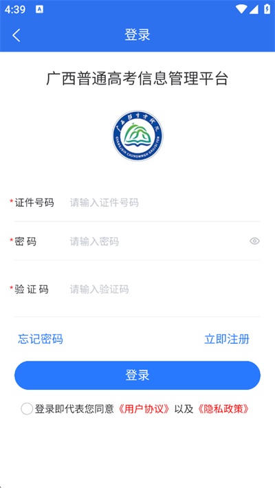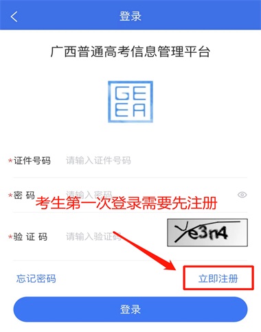 打开广西普通高考信息管理平台 App,首次使用需先完成注册。