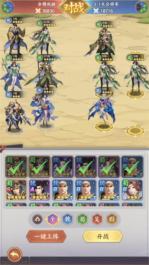 4、上阵方面直接使用一键即可,后面角色多可以自由搭配上阵体系;