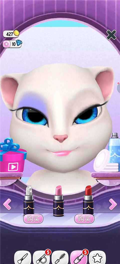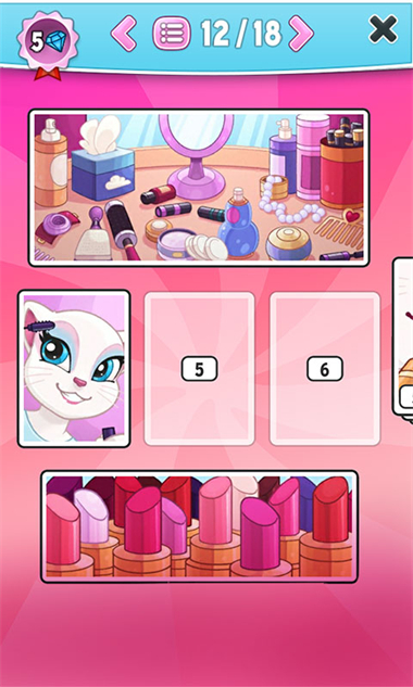 除了基本的照料,游戏还有丰富的装扮系统。你可以给安吉拉换上百种发型、妆容和服装,每天都可以给她捯饬出不一样的造型。尤其是口红的部分,可以只涂下半部分,这个细节真的很贴心!