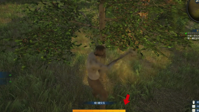 4、站在树木或资源矿床旁,按下"E键"即可自动装备采集工具。要使用工具收集资源,按住"E键"或"鼠标左键;