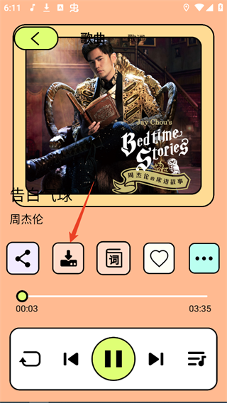 1、首先需要点击进入所选音乐界面,然后点击图示下载按钮,直接在音乐列表选择下载可能会失败。