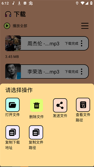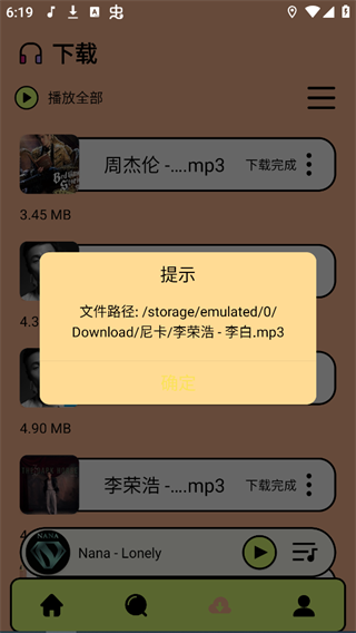 2、下载完成的音乐可以在尼卡音乐App中查看,也可以点击音乐右侧菜单查看本地保存的位置。