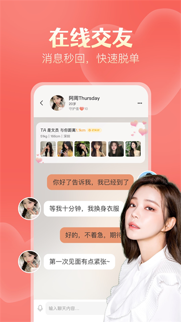 由于女用户占比高,男生无论条件,在探遇均能匹配到多位单身异性,从中选择自己喜欢的女生,回复速度超快!