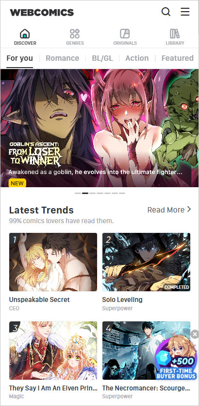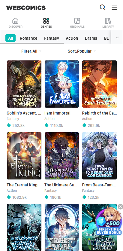 WebComics是一款漫画阅读软件,内容库非常丰富,涵盖了浪漫爱情、动作冒险、奇幻玄幻、BL/GL、恐怖、校园、剧情深刻等多种类别,基本能满足大多数读者的兴趣。平台不仅有经典和热门的作品,还会定期更新新作品,保持内容的新鲜感。另外,WebComics还提供每日限时免费阅读福利,用户可以在特定活动期间免费获取部分章节,同时通过内购支持创作者和平台运营。