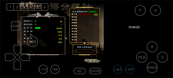 4、关卡通关后进入得分统计界面,可查看击敌数、命中率等数据,输入姓名记录排行榜成绩。