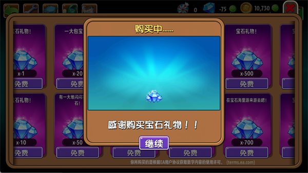 3、点击购买按钮后,系统会显示“感谢购买宝石礼物”的信息,表示你已经成功获得钻石。