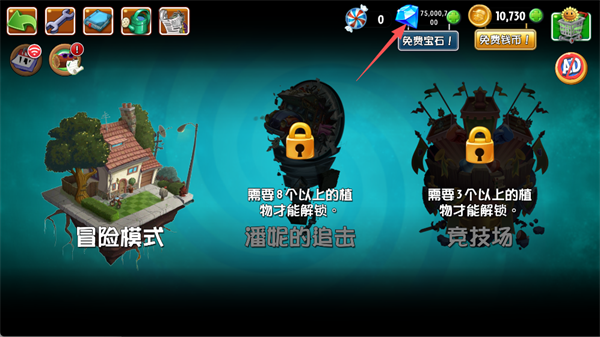 1、打开植物大战僵尸2中文版破解版,进入主界面。在右上角找到并点击钻石图标,进入钻石商店。