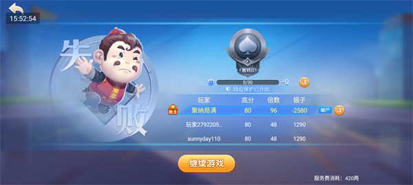 如果对局失败,界面会显示银两扣除和段位保护状态。当你出现破产时,系统会给予提示,提醒你重新匹配对局。点击“继续游戏”即可重新挑战。