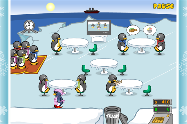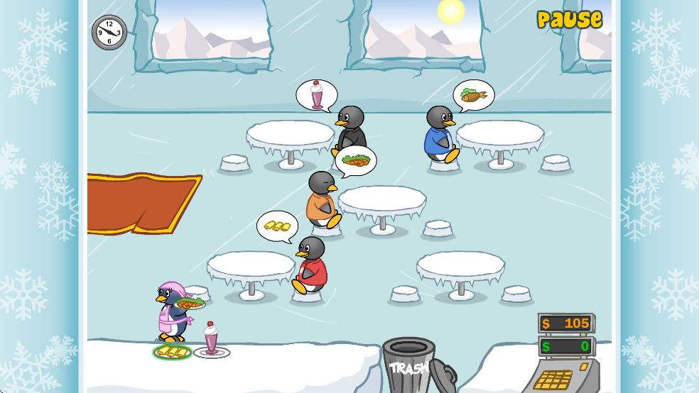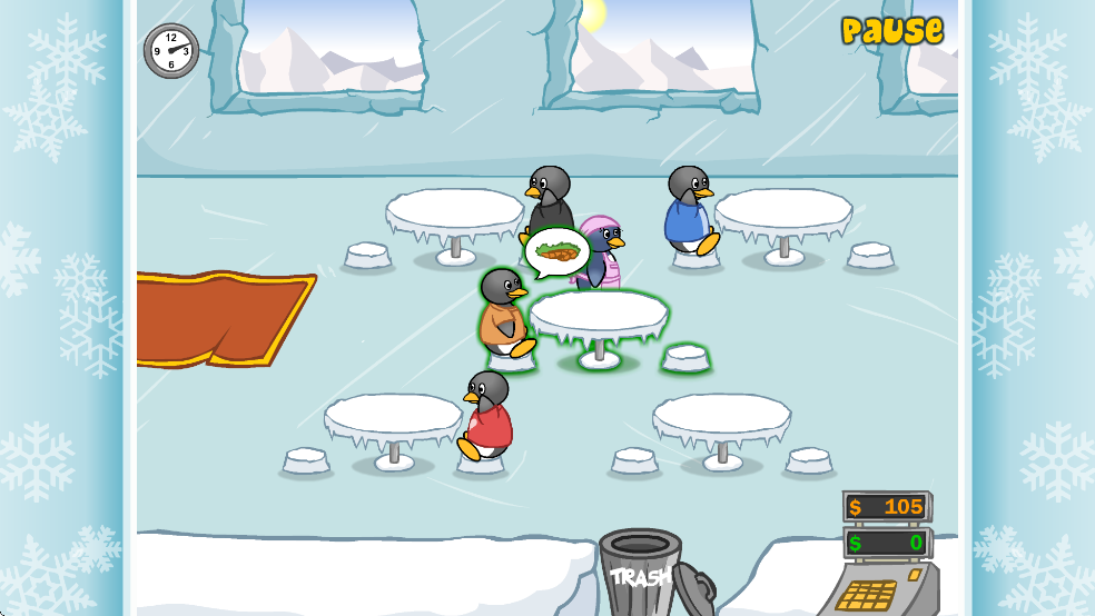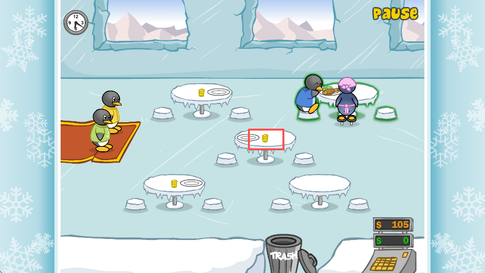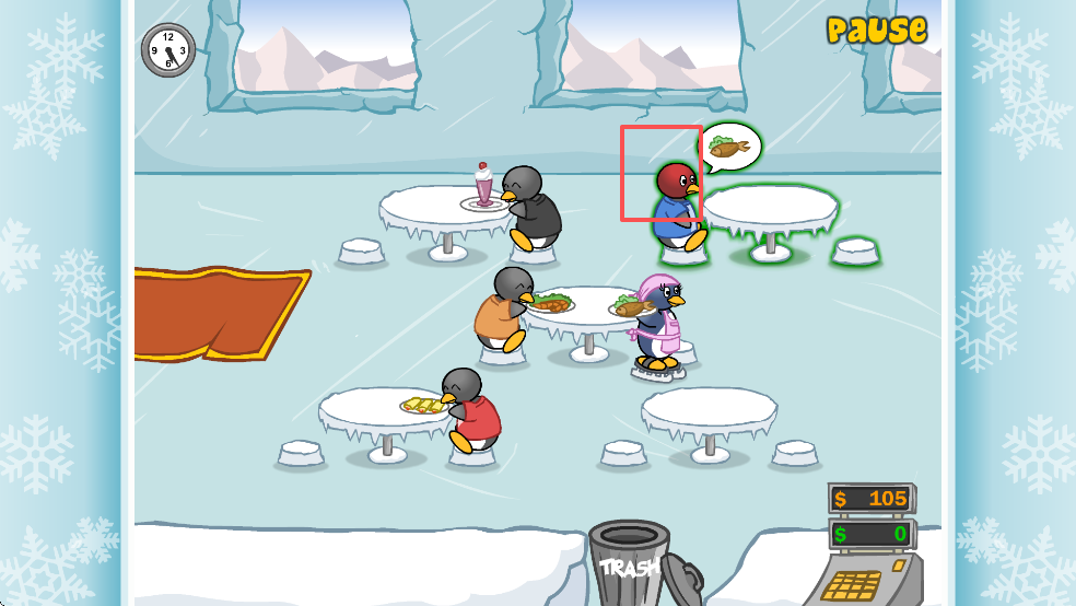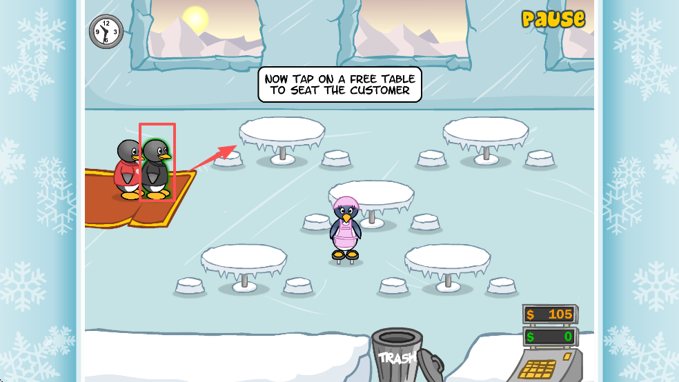 3、进入游戏后,将企鹅顾客分配到空桌上