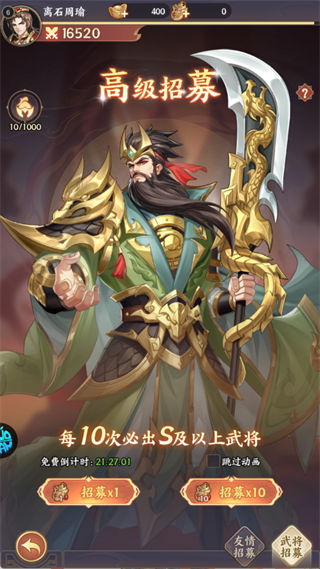 使用招募令可抽取武将,每10次招募必出S及以上品质武将,是玩家获取高星强力武将的核心玩法。