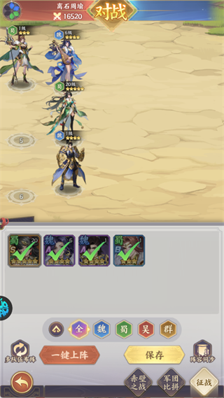 玩家可根据武将阵营(魏/蜀/吴/群)、品质搭配出战阵容,合理布阵是通关关卡、提升战力的核心,同时支持一键上阵、多队伍布阵等便捷功能。