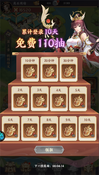 在累计登录方面,10天内可免费领取110抽的招募令;而使用招募令进行抽卡时,每10次必出S级及以上武将,极大提升了玩家获取强力武将的效率。主线战役是解锁游戏内容和提升主公等级的核心玩法,同时还能获得招募令等奖励。