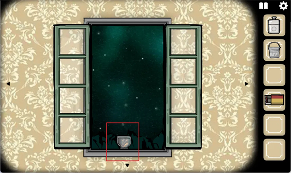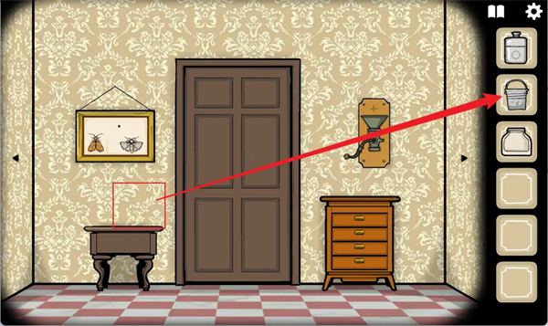 随后我们来到另一边门口左边上有个水桶,右边抽屉中有个火柴,我们全部拿走,抽屉上方还有一个玻璃罐,与之对应则是缺了一个标本的展示框,暗示我们要去抓一个昆虫回来