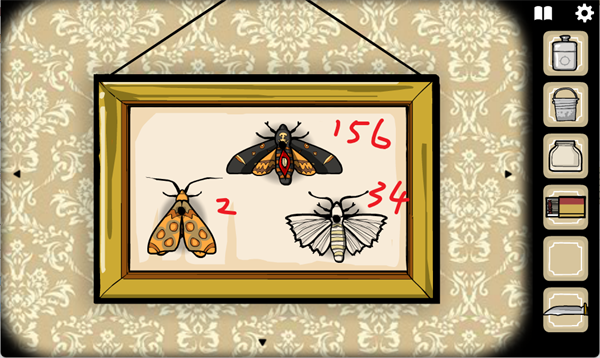 我们将飞蛾放在那个标本展示框上,根据一个房间提示,对应图案的昆虫有着对应的点击顺序(已标在图上)