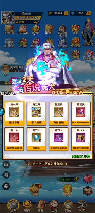 连续登录8天可免费领取传说船员赤犬、集结卷轴、自选宝箱等,是前期核心角色与资源的免费获取渠道。