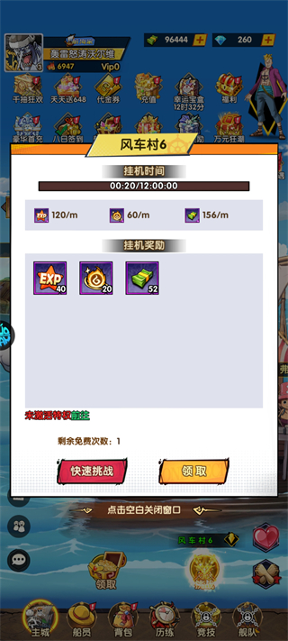 挂机可自动产出经验、灵魂、贝里,每日领取+免费快速挑战,能轻松获取养成资源,解放双手。