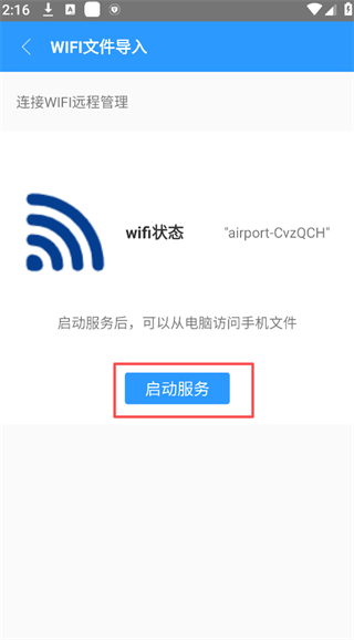 3、在WiFi文件导入界面,点击蓝色的「启动服务」按钮,开启远程文件访问服务。