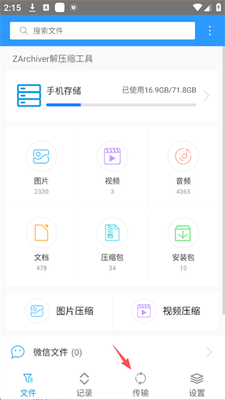 1、打开ZArchiver解压缩工具手机版,在底部导航栏点击「传输」选项卡,进入文件传输页面。