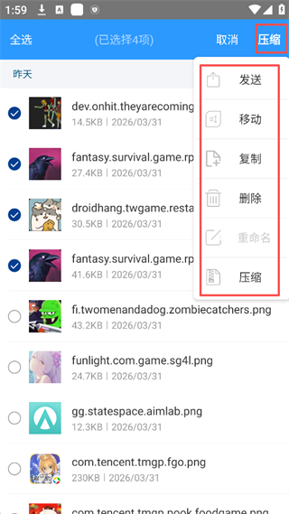 在文件列表中勾选要压缩的图片 / 视频,点击右上角「压缩」,也可通过更多操作栏的「压缩」选项发起压缩。