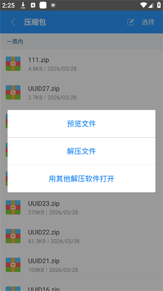 在压缩包列表中点击目标压缩包,会弹出操作菜单,可选择「预览文件」「解压文件」「用其他解压软件打开」三种核心操作。