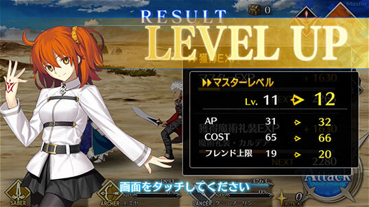 不仅是从者,御主(玩家角色)也会成长。 战斗胜利后获得的经验值(EXP)在累计到一定值后,御主的等级就会提升。 等级提升后,行动力、COST(影响可编入队伍的从者。 )、好友人数上限会提升。 并且御主通过装备不同的魔术礼装,自身的技能(御主技能)也会有所变化。