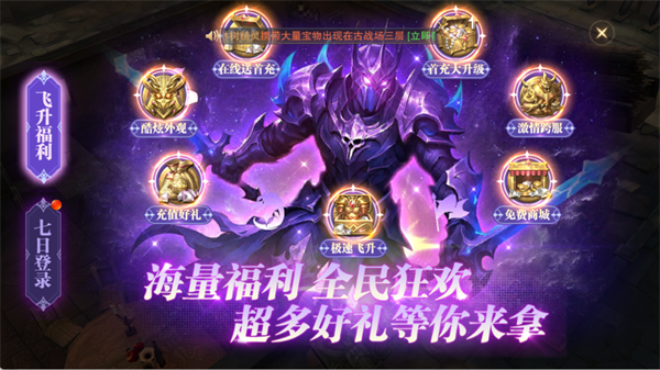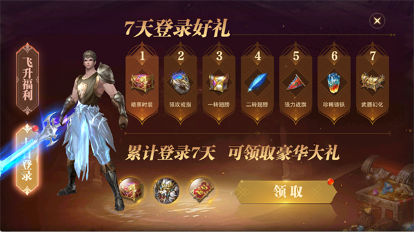 累计登录7天即可免费领取暗黑时装、一转/二转翅膀、武器幻化等开荒核心道具,零氪也能快速成型。