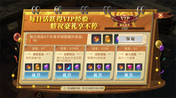 完成日常任务即可免费获取VIP经验,0氪也能解锁VIP特权,还能领取宝石、强化材料等养成资源。