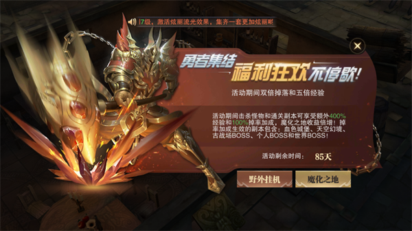 活动持续85天,享受五倍经验、双倍掉落加成,魔化之地收益倍增,是快速升级、刷装备的黄金期。