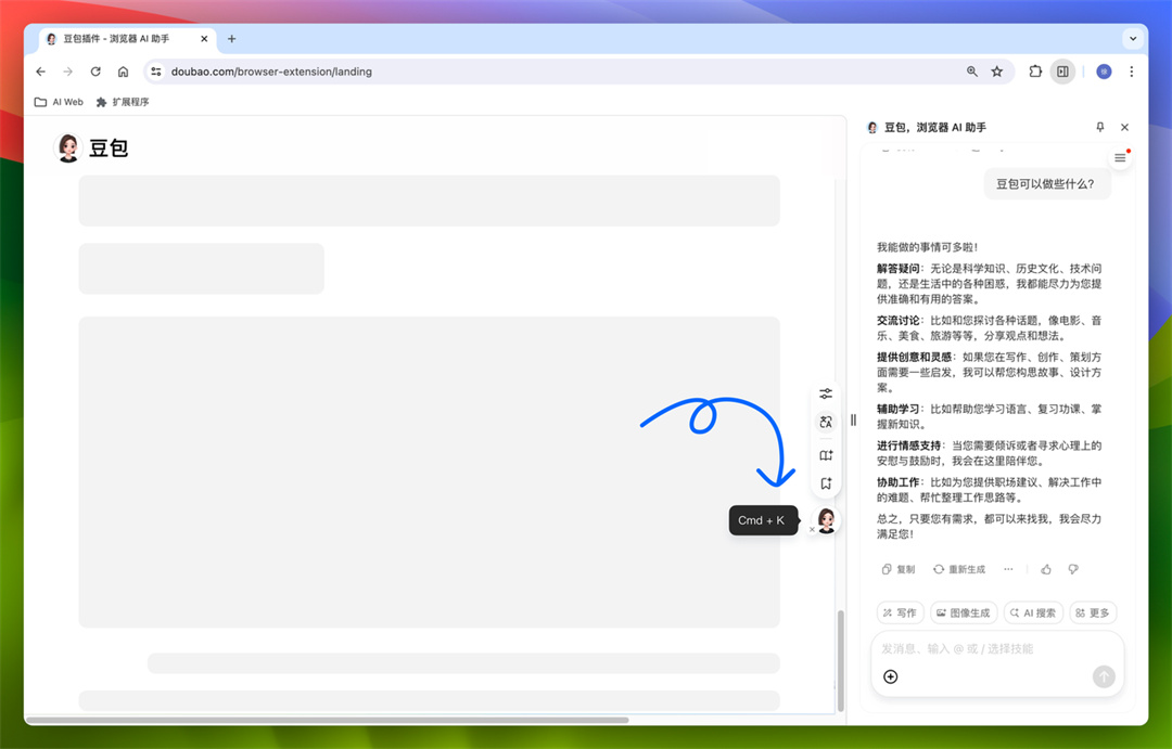 只需要点击在网页上悬浮的豆包头像,或者使用快捷键 Ctrl+k(Windows)或 Cmd+k(Mac),即可唤起豆包进行问答
