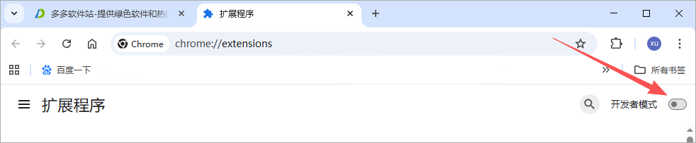 2、将'管理扩展程序' 页面的右上角 '开发者模式' 的开关打开