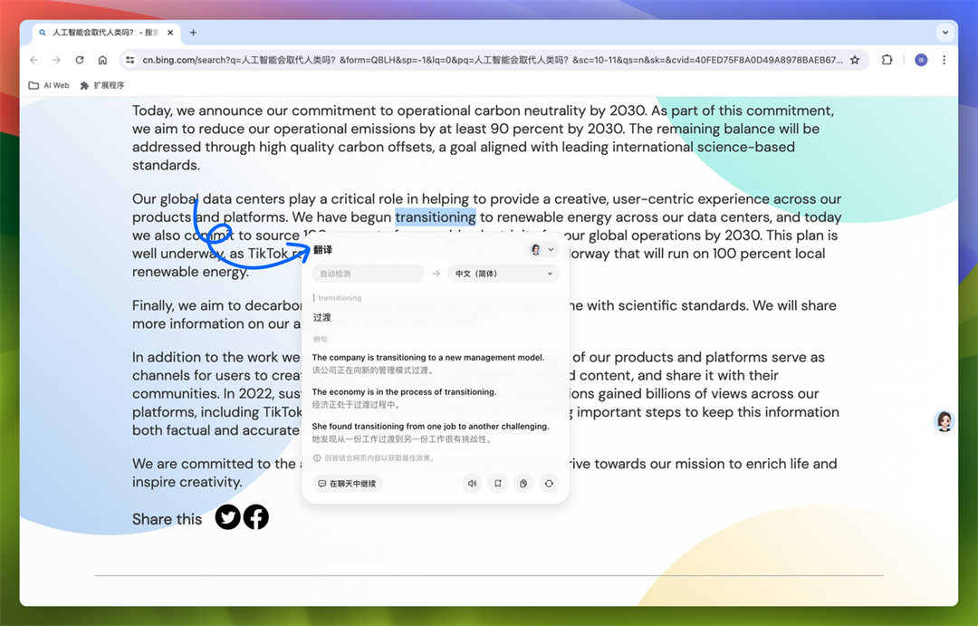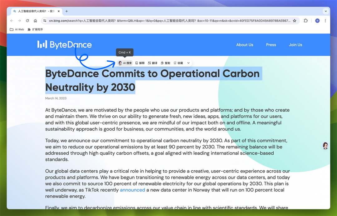豆包能帮你 AI 搜索、解释、翻译这一片段内容,帮你更理解当前网页的内容。