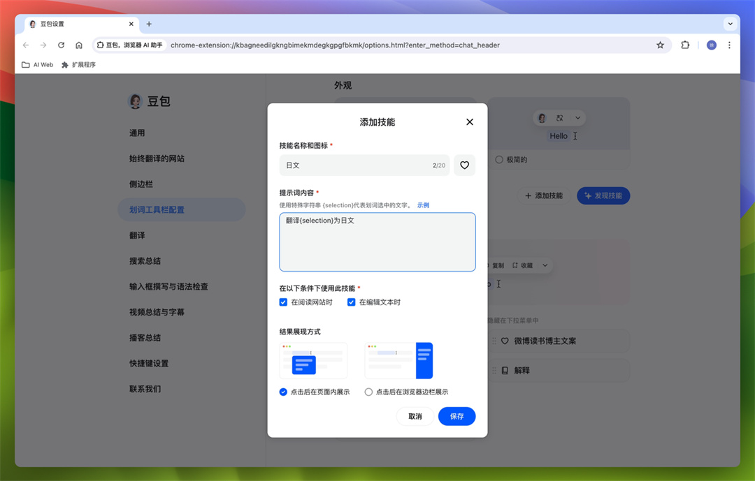 - 也可以在配置中“添加技能”,保存自己写的提示词,并快捷展示在划词工具栏中,让豆包大模型生成你需要的文字。