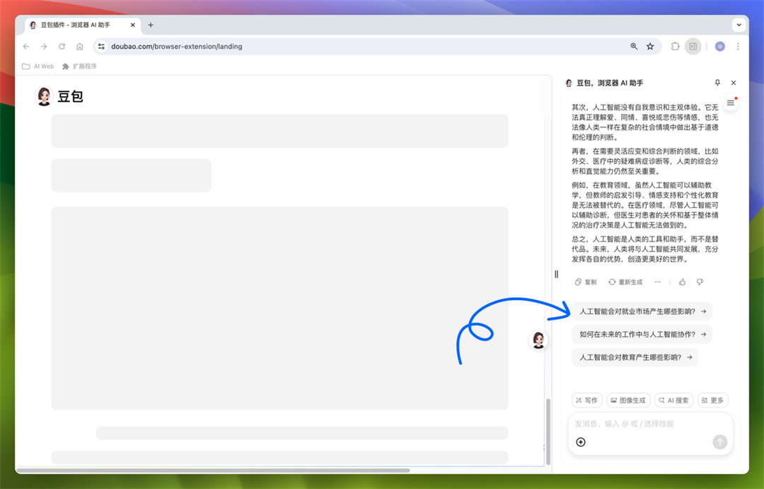 在浏览网页时,一键打开与豆包随时互动提问。