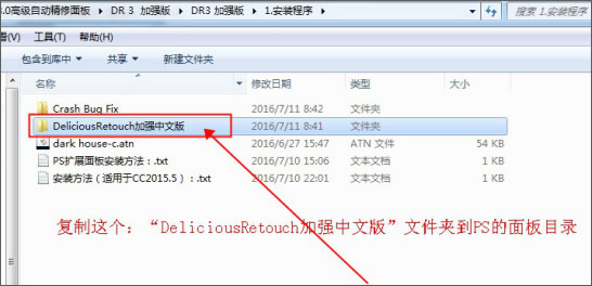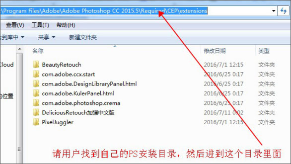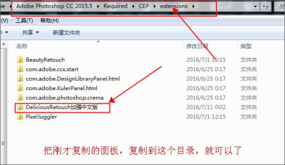2、然后打开购买下载得到的扩展面板,找到:“DeliciousRetouch加强中文版”文件夹,然后复制这个文件夹,粘贴到刚才打开的PS面板目录:D:\Program Files\Adobe\Adobe Photoshop CC 2015.5\Required\CEP\extensions(PS安装在哪个盘就打开相应的盘符,我这里是装在D盘,所以打开的是D盘,如果你的在C盘,那就是C盘)