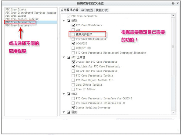 10、接下来到了应用程序选择对话框,请参考下图进行设置,演示安装路径为 D:\ptc。