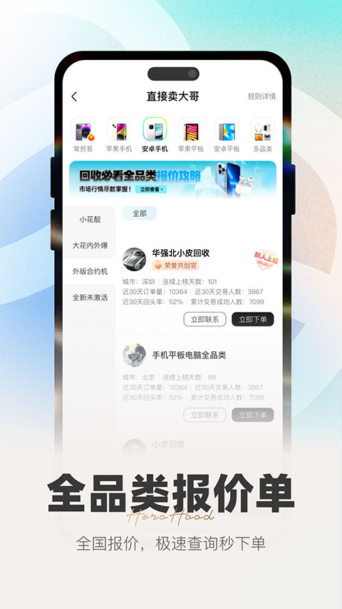 对于下游B端商家而言,APP提供了稳定可靠的二手数码产品来源。商家可以通过平台快速搜索到符合需求的货源,满足高品质需求,显著缩短二手手机产业的流通周期,极大提升交易效率。