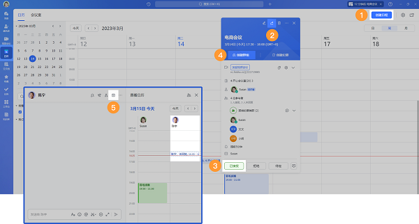 创建日历:灵活设置主题、时间、地点、参与者等信息。你可以在日程编辑页直接搜索并选择同事或群组,邀请他们加入日程