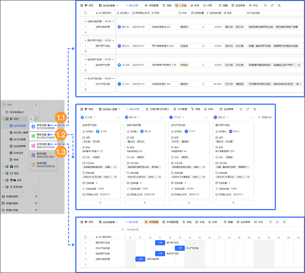 多视图:你输入的字段为信息源,同一个信息源可以切换表格、看板、甘特图、仪表盘等多种视图,以适配不同场景:人员管理、货品管理、进度管理等