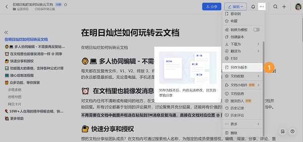 管理云文档的不同版本:文档内容需要迭代,无需创建多个副本,可存为不同版本。版本可单独删除、分享、查看
