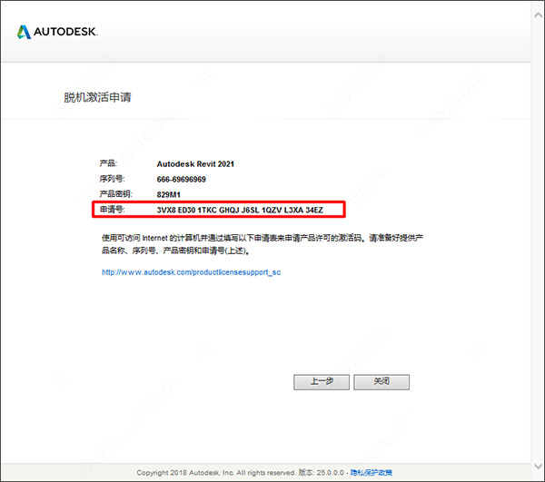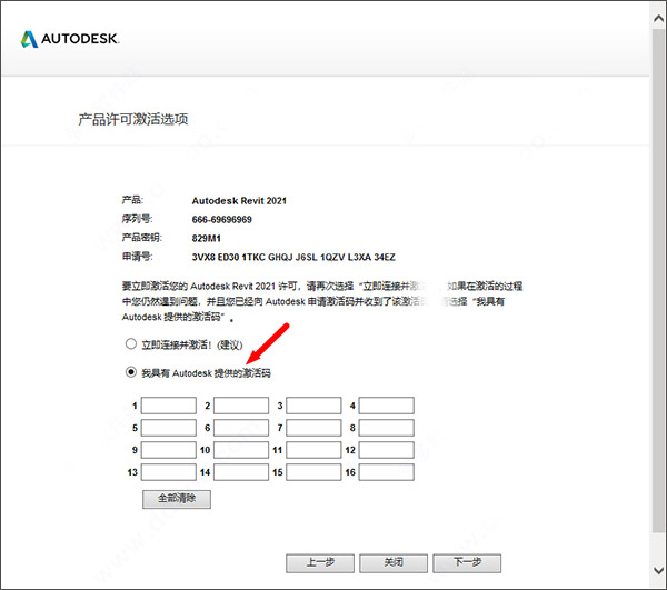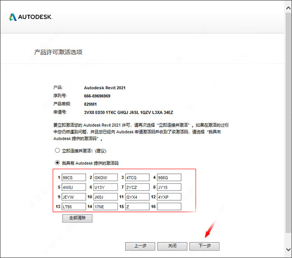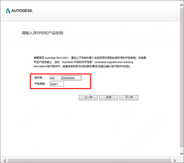 11、输入revit2021序列号【666-69696969】和密钥【829M1】,点击下一步继续;