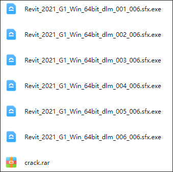1、下载全部文件后得到autodesk revit 2021中文原程序和crack注册机文件,首先运行"Revit_2021_G1_Win_64bit_dlm_001_006.sfx.exe"开始安装原程序;
