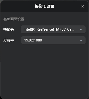 点击添加素材按钮后会在当前的场景中添加一个新的素材,并打开素材的设置面板(如下是摄像头的设置面板),大家可以在面板中调节各个参数,调整完成点击右上角“x”关闭设置面板即可