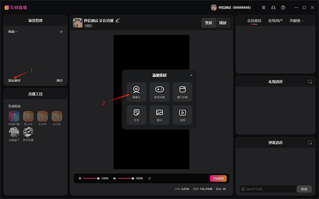 点击添加素材,并在弹窗点击摄像头添加一个摄像头(伴侣目前提供了6类素材,大家可以根据自己的需求添加)