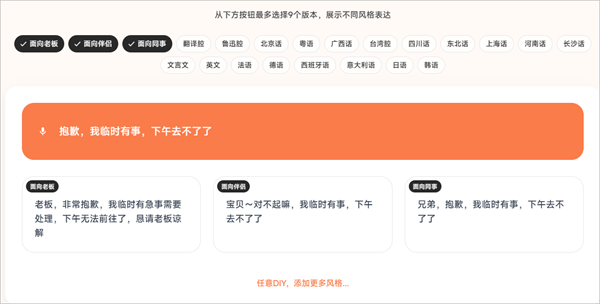 3、支持“严谨商务”“轻松社交”“专业学术”“温柔伴侣”等多种模式,同一句话在不同场景下自动调整表达。