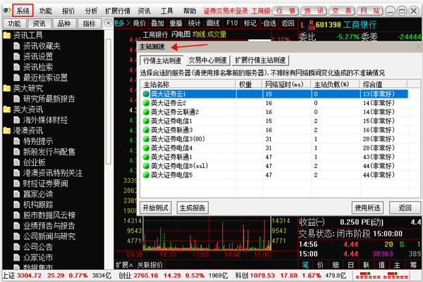 3、进入英大证券系统之后,点击菜单栏“系统”中的主站测试,检测目前能链接到的行情和交易主站s以及每个主站的速度,以便您选择更快更方便的主站收看行情。即时交易。其中网络延时越慢,则速度越快;主站负载表示现在使用该站的人数。后面迹给出了综合值。