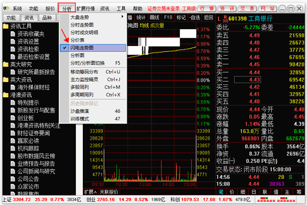 7、闪电走势图能更加直观地看到股票地整体走向和涨跌状态,要想看到这个图只有选择菜单栏“分析”里的“闪电走势图”就可以调出来了。闪电走势图是按照每笔画一个点的方式画出当日的走势图;分时走势图是每分钟画一个点;相比分时走势图,数据更加细致一些,常用于权证操作及期货操作上面。